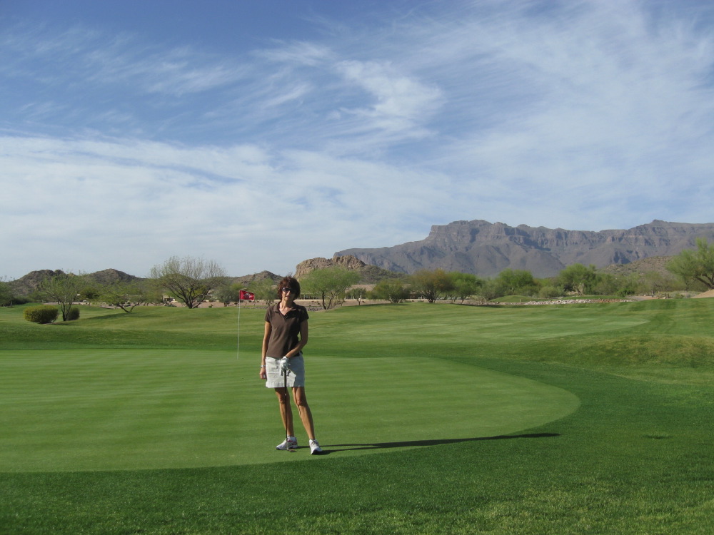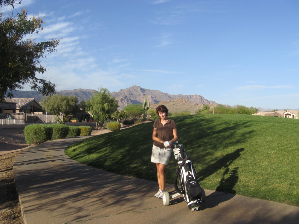 Friday: Still had internet problems — on and off all day. Irmy called Sue and had to redial many times because our connection kept cutting out. Sue went for a run around the block. She finished reading her two books, “The Hunger Games” and I don’t know what the other book was. After lunch we watched the Masters Golf on TV. Sue called Val and told her the news about Alex. Sue with a driver on Hole 8Then at around 4pm we went golfing. Had to wait for a couple of carts to go by and finish their tournament and then we had the course to ourselves. For a while we were shooting two balls each. A highlight was when we both reached the green with our tee shots on Hole 7 — and came away with a birdie for me and a par for Sue. Really, other than that, the scoring wasn’t very good for me. We each lost a ball. But we had fun. We returned our movie rental and then went to Bashas to pick up a pizza for supper. Added extra toppings. Watched the end of the Masters on TV while we ate less than half of the pizza. The pizza was bit of a disappointment, but we’ll probably finish tomorrow and then be on to better things for Sunday. Watched some ‘news’ shows on TV and went to bed early. Tired. It felt like Saturday all day today, but it was actually Good Friday. Yippie! that means there’s still 2 more days of weekend to come!