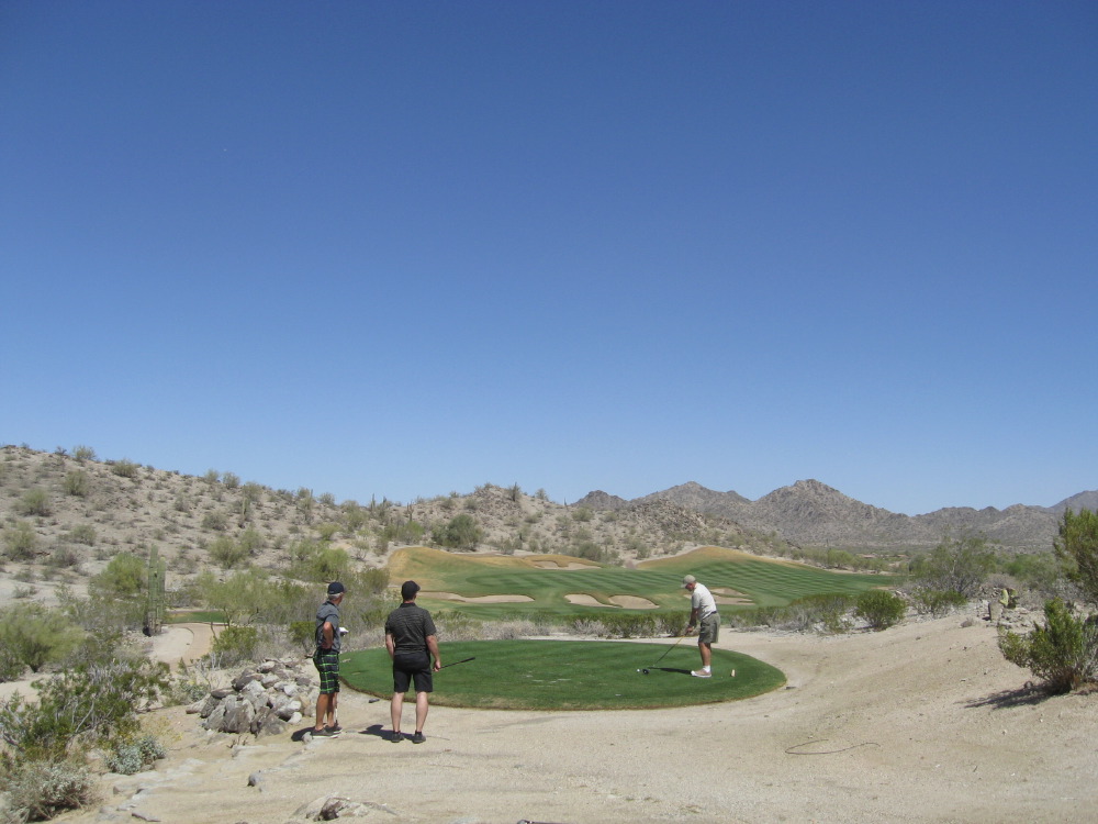 Friday: Because it was supposed to be another hot day, we went for our morning hike early today. Actually, I got up early today — 6:00am. So I had time to finish reading my Louis Zamperini (Unbroken) book. Then we went for a hike up Silly Mountain. In the afternoon Sue read, I talked to Koop on the phone for a bit. At 4:30 we went to pick up our next DVD at Walgreens and then headed to the golf course. We golfed the back nine today — Sue thought it was great. I played poorly, lost too many balls, had way too many terrible shots. But the scenery was great. We were done at around 6:30. Stopped by at Bashas on the way home — Sue picked up a few groceries and some cheese for tonight’s ‘cheeseburger’ pizza; I picked up some Guinness. Sampled a few of the beers with my pizza. Then we watched two episodes of Kitchen Nightmares and one episode of 20/20. By the time that was done (10pm) I was nodding off in my chair. Went to bed. It’s supposed to be windy tomorrow, then cold and rainy on Sunday and Monday. Not quite the weather we’ve sort of come to expect here.