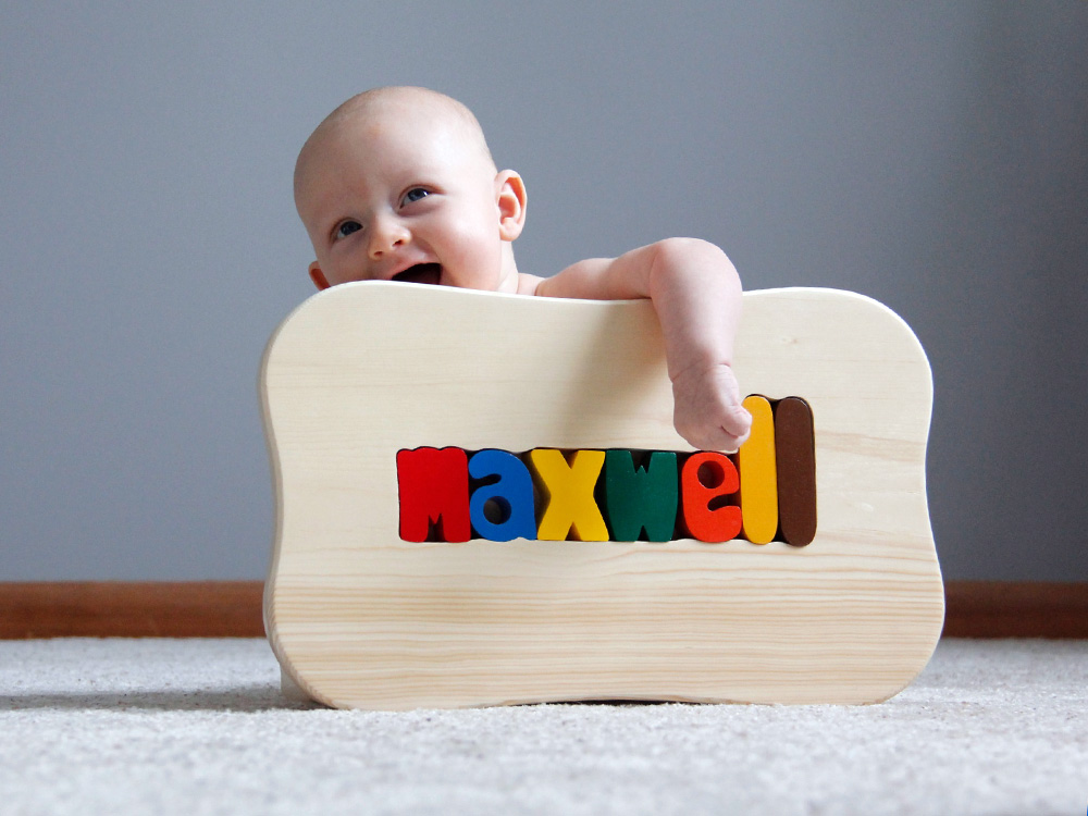 A happy boy, with his little wooden personalized bench.